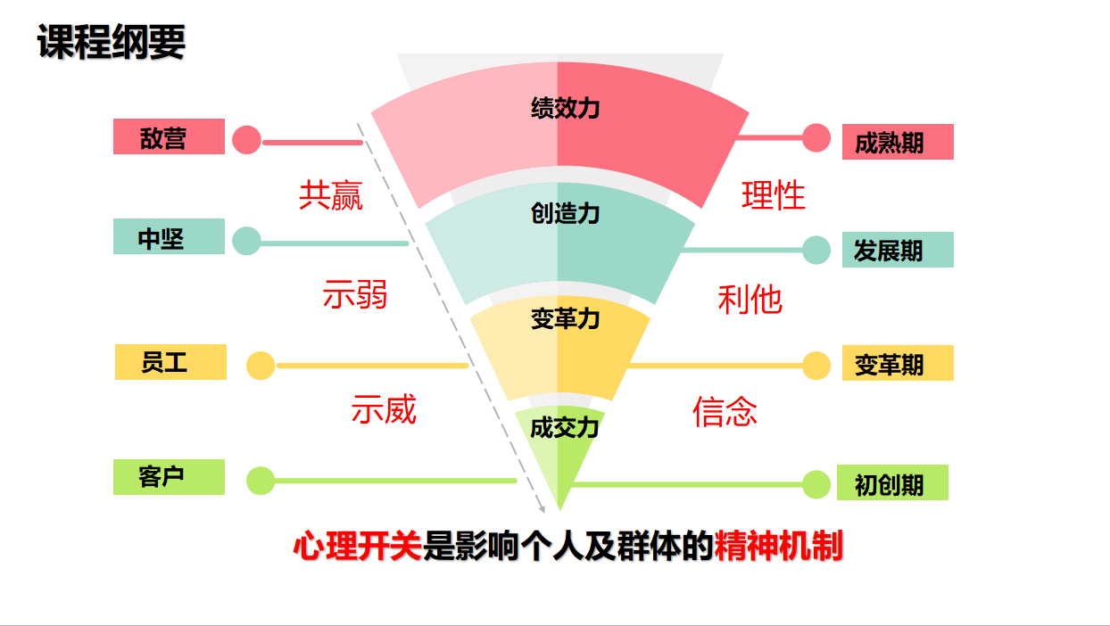 5G時代,管理者越來越年輕化,多樣化,精神豐富化。傳統管理人與物的管理方式凸顯出資源有限,管理對象心理欲望無窮。在企業管理中人是最重要的資源,今天重視人的心理感覺,發揮人的主動精神,挖掘人的潛在能力顯得更重要。因此,本版權課程管理心理學著重研究人的心理活動的規律性,重點解決企業最為關注的人的成交力、激活人的變革力,提升人的創造力,從而提升組織的績效力。課程將在對人科學分析的基礎上,了解人的心理規律,提供大量有效的管理心理工具,提升企業核心競爭力,從而實現企業管理取得最佳的實踐。